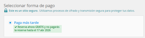 "Paga más tarde" consiste en realizar la reserva indicando un número de tarjeta como garantía, pero no se cargará nada en el momento de confirmar la reserva.