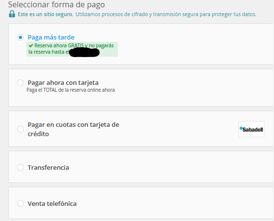 Las formas de pago que verás en pantalla dependen exclusivamente de la tarifa seleccionada. Si el sistema solo te ofrece una (por ejemplo, solo paga ahora), significa que esa tarifa específica no admite otros medios de pago.