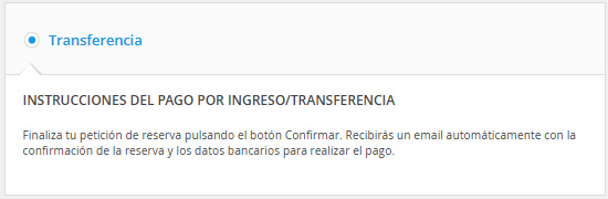 En algunas reservas de hotel con forma de pago "Pago Online", se ofrece el pago por transferencia.