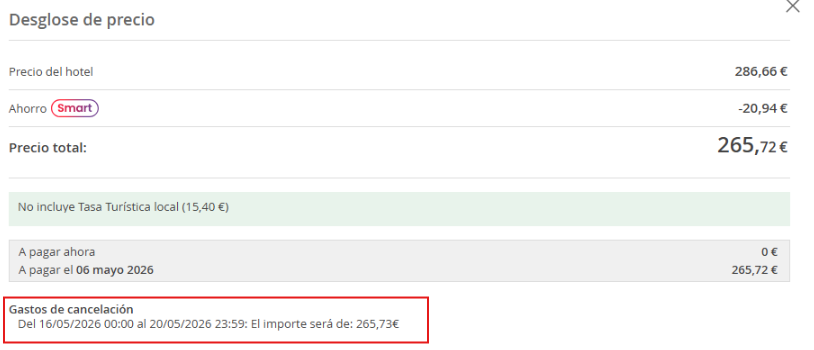 - Gastos de cancelación: el importe que se aplicaría en caso de cancelar, según el tramo de fechas en el que se realice, o si es una tarifa No reembolsable.