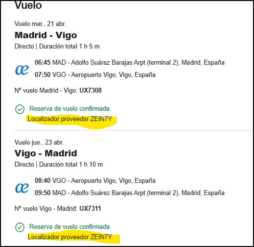 El localizador consta también en el apartado de "Vuelo", pero en este caso aparece encima de los detalles de los vuelos contratados: