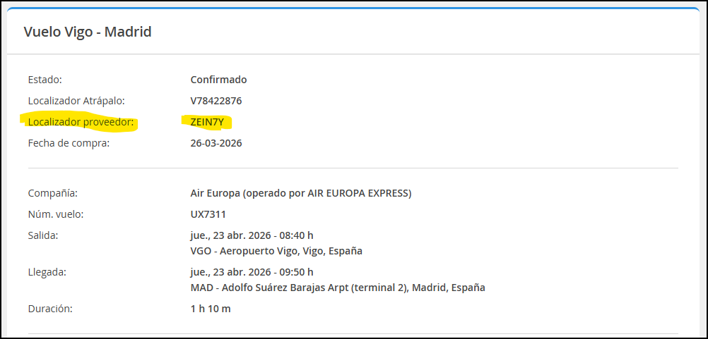 El localizador consta en el apartado de "Vuelo". Debajo de los detalles de cada tramo de vuelo aparece como "localizador proveedor":